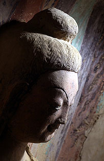 敦煌鳴沙山缺乏堅(jiān)硬的巖石,所以從一開(kāi)始就是泥塑。北朝時(shí)期,敦煌泥塑塑像有釋迦佛、肋侍菩薩、釋迦苦修、禪僧等題材,造型上也受犍陀羅藝術(shù)的影響。但第259窟正龕的釋迦牟 尼和多寶佛,右壁龕上的被譽(yù)為“東方蒙娜麗莎”的單身坐佛,俯身向前,含著微笑;第248窟的彩塑坐佛,衣褶流動(dòng),唇角上翹,一手拂膝,一手做手印。它們都已有中國(guó)特色。到西魏時(shí)出現(xiàn)了秀骨清像風(fēng)格,北周后逐漸變得豐滿,到了隋唐就愈加圓潤(rùn)豐肥,形成了盛唐風(fēng)范。