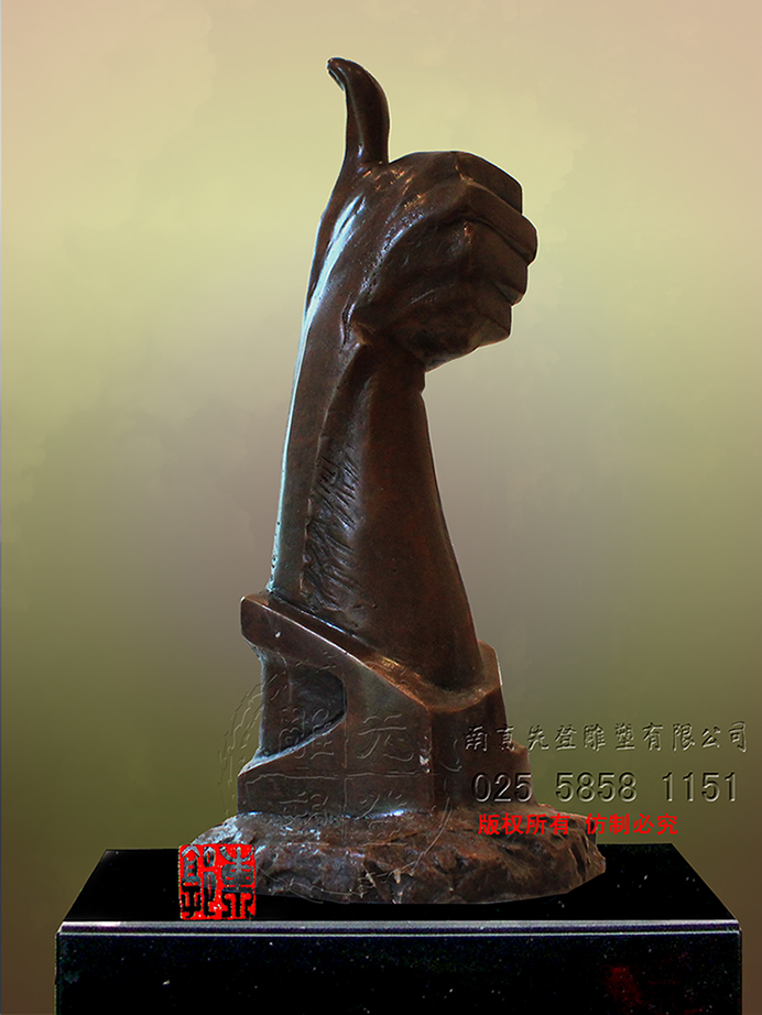 若要用一個詞來形容眼前的雕塑,莫過于“芝華士”了,沿用克里斯汀·拉科魯瓦對芝華士的評價“在我看來,有些名字,哪怕只是聽人提起或在書中偶遇,就會不自覺地將其與'聲名顯赫'聯(lián)系起來,因為這些名字本身就代表著一種品質(zhì)、一種權(quán)威或者一種奢華氣質(zhì)。對我而言,'芝華士'這三個字就是'時尚'、'奢華'、'尊貴'的代名詞。”一種酒何以用“奢侈”、“最貴”、“時尚”來形容?路人皆知,喝芝華士是一種享受,將酒提升為藝術(shù),由內(nèi)而外的品鑒,是一種邊緣文化潮流化,這一切不僅源于調(diào)酒師Colin Scott以及精湛絕倫的技術(shù),而且他擁有世界頂級設(shè)計師克里斯汀·拉科魯瓦、亞歷山大•麥克奎恩。然而一尊雕塑,何以用一種酒來代稱?其實不然,芝華士的定義早已并非一樽酒而已,芝華士,享有世界蘇格蘭高級威士忌,他是外在與內(nèi)在的統(tǒng)一,誠如雕塑所塑造的舉起的大拇指,同等的是一種邊緣文化,她需要人們鑒賞品位,需要足夠的情趣與審美素質(zhì)。如同芝華士所代表的“時尚”“豪華”“尊貴”,雕塑依然具有最豪華的陣容,華麗端莊的金箔,剛毅的輪廓,以及人類機理特征所表現(xiàn)的自然之美,他是藝術(shù)家獨具匠心的杰作,是一樽東方的皇室威士忌,享有與芝華士同樣的尊榮。用它來界定雕塑,而且是眼前獨具匠心的雕塑,是源于其洗凈鉛華般的唯美設(shè)計風(fēng)格以及其醇和出眾的口感,如雕塑從內(nèi)而外,周身所散發(fā)出的氣質(zhì)。